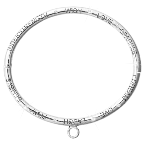 B1104S19 Good vibes’ bangle (dream, live, laugh, pray, believe, inner strength, wish, love, sparkle) with one loop where a charm can be attached, silver plated and 19cm